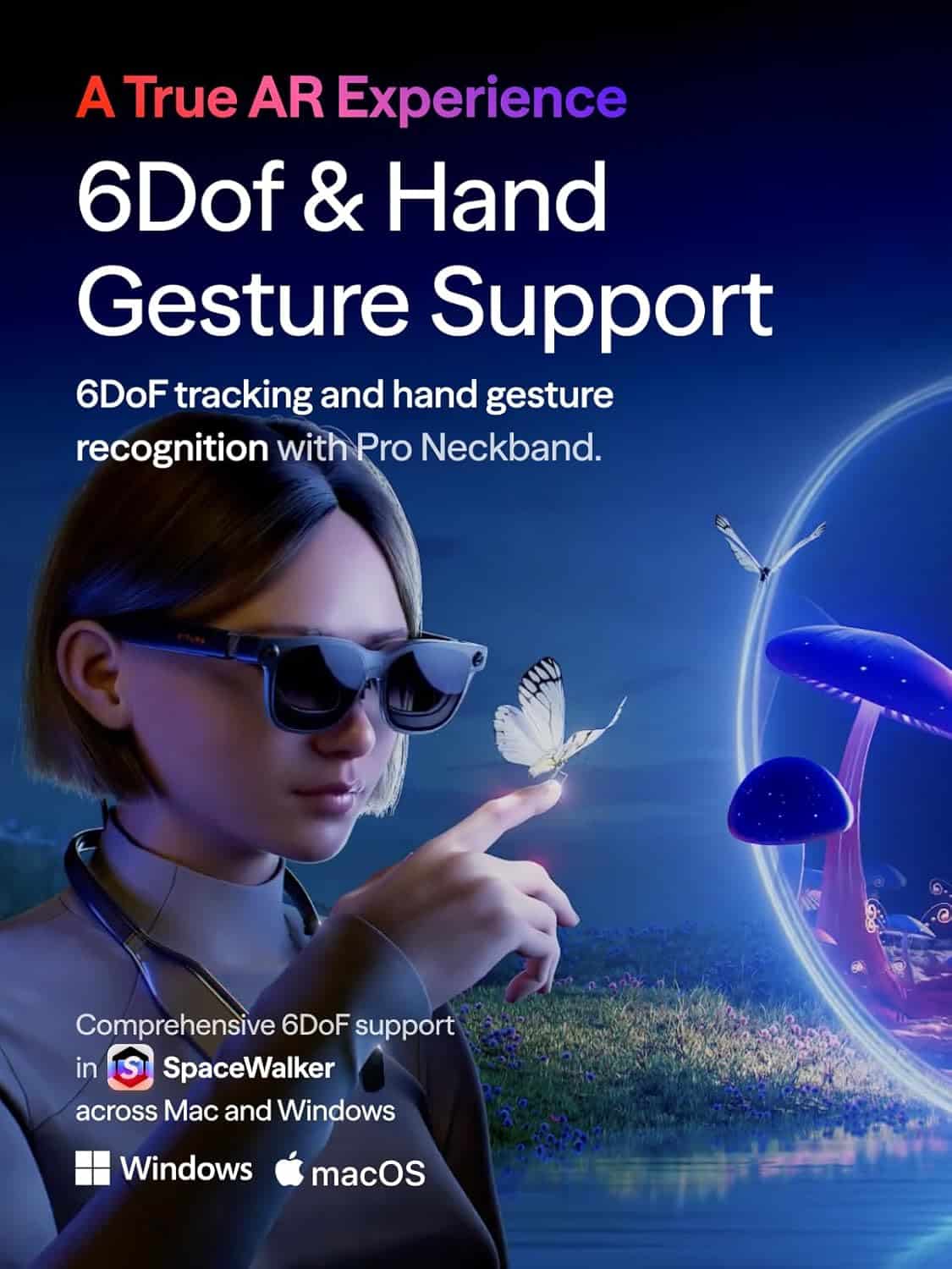 Priekšējā RGB kamera un divas dziļuma kameras nodrošina precīzu 6DoF izsekošanu, roku žestus un telpisko skaitļošanu. Tas būtiski uzlabo kustību precizitāti un telpisko uztveri gan darbam, gan XR mijiedarbībai. Pilns 6DoF atbalsts ir pieejams ar SpaceWalker macOS un Windows vidē (nepieciešama VITURE Pro kakla siksna).