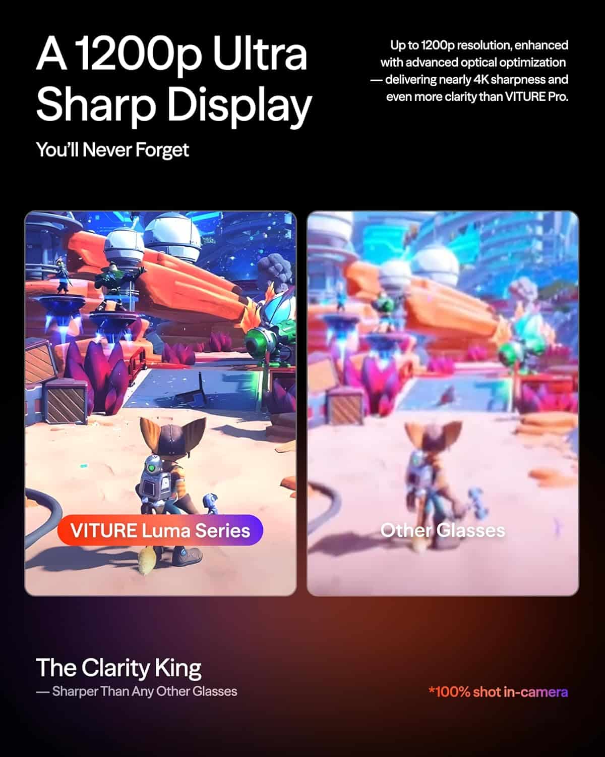 VITURE Luma Ultra XR piedāvā iespaidīgu 1200p īpaši asu attēlu, kas ir vēl asāks nekā VITURE Pro. Virtuālais ekrāns līdz 152 collām rada sajūtu, ka skatāties 4K līmeņa saturu — teksts ir izcili skaidrs, detaļas precīzas un attēls dabisks.